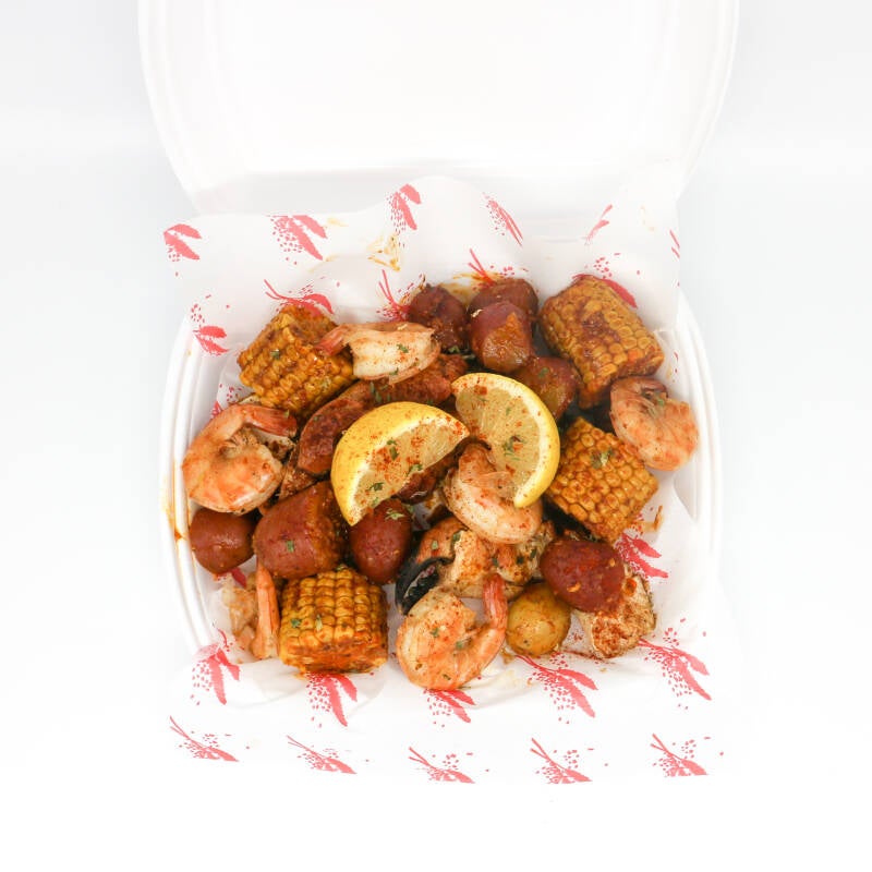 Mix is incl. aardappelen, mais, garnalen, crabclaws en saus